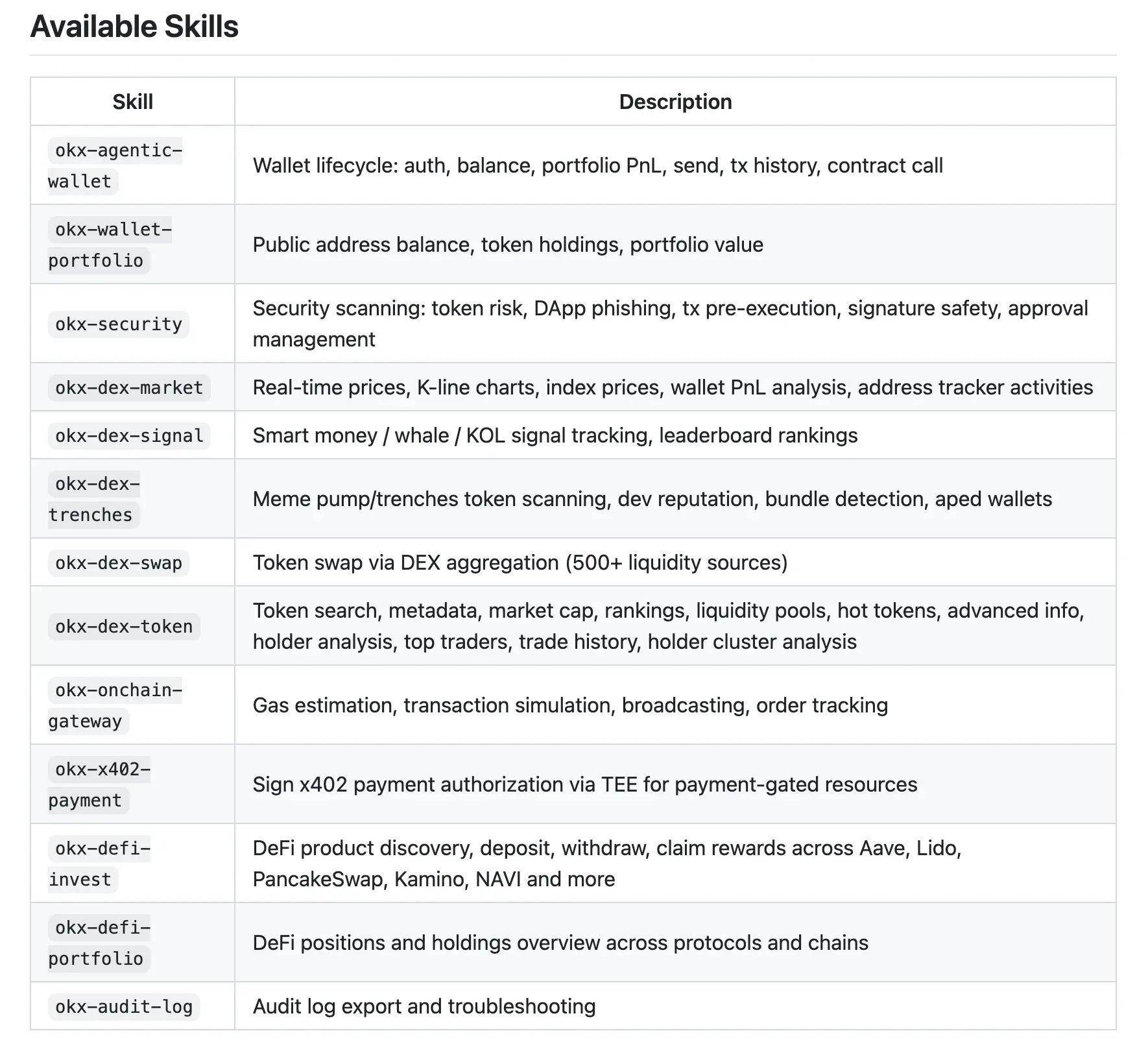 OKX는 최근 두 개의 중량급 지갑 기술을 추가했습니다. okx-agentic-wallet는 에이전트에게 안전한 체인 상 지갑을 제공하며, okx-wallet-portfolio는 크로스 체인 자산 추적 기능을 제공합니다. OKX의 DeFi 투자 기술(okx-defi-invest) 및 DeFi 포지션 추적(okx-defi-portfolio)과 결합하면, OKX 생태계 내에서 지갑에서 투자 및 추적까지의 전체 폐쇄 루프를 구현할 수 있습니다.