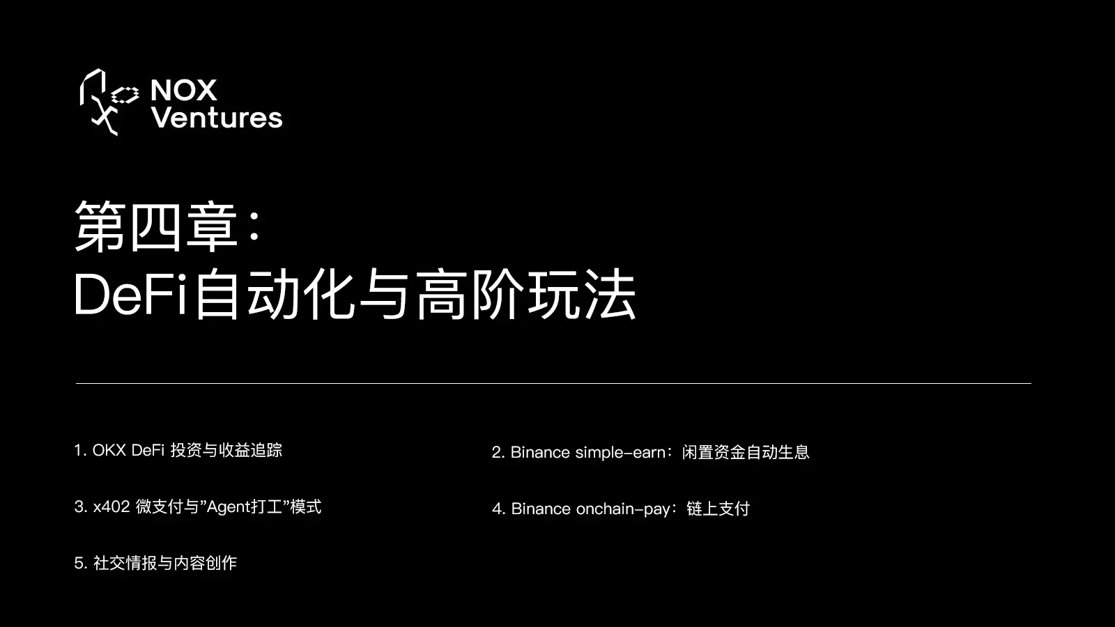 OKX가 새롭게 출시한 DeFi 투자 기술 조합은 현재 가장 완벽한 "원스톱 DeFi 관리"입니다. okx-defi-invest는 에이전트가 다양한 DeFi 프로토콜에 직접 참여하여 투자(스테이킹, 대출, 유동성 채굴)를 할 수 있게 해주며, okx-defi-portfolio는 각 DeFi 프로토콜에서의 포지션과 수익을 실시간으로 추적합니다. okx-cex-earn은 CEX 측의 재테크 상품을 관리합니다.